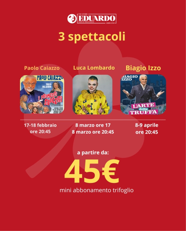 Data: Turni in abbonamento, A.B - Biagio Izzo con L'arte della truffa 8.9 aprile- Paolo Caiazzo con I Promessi Suoceri il 17.18 febbraio - Luca Lombardo l'8 marzo
