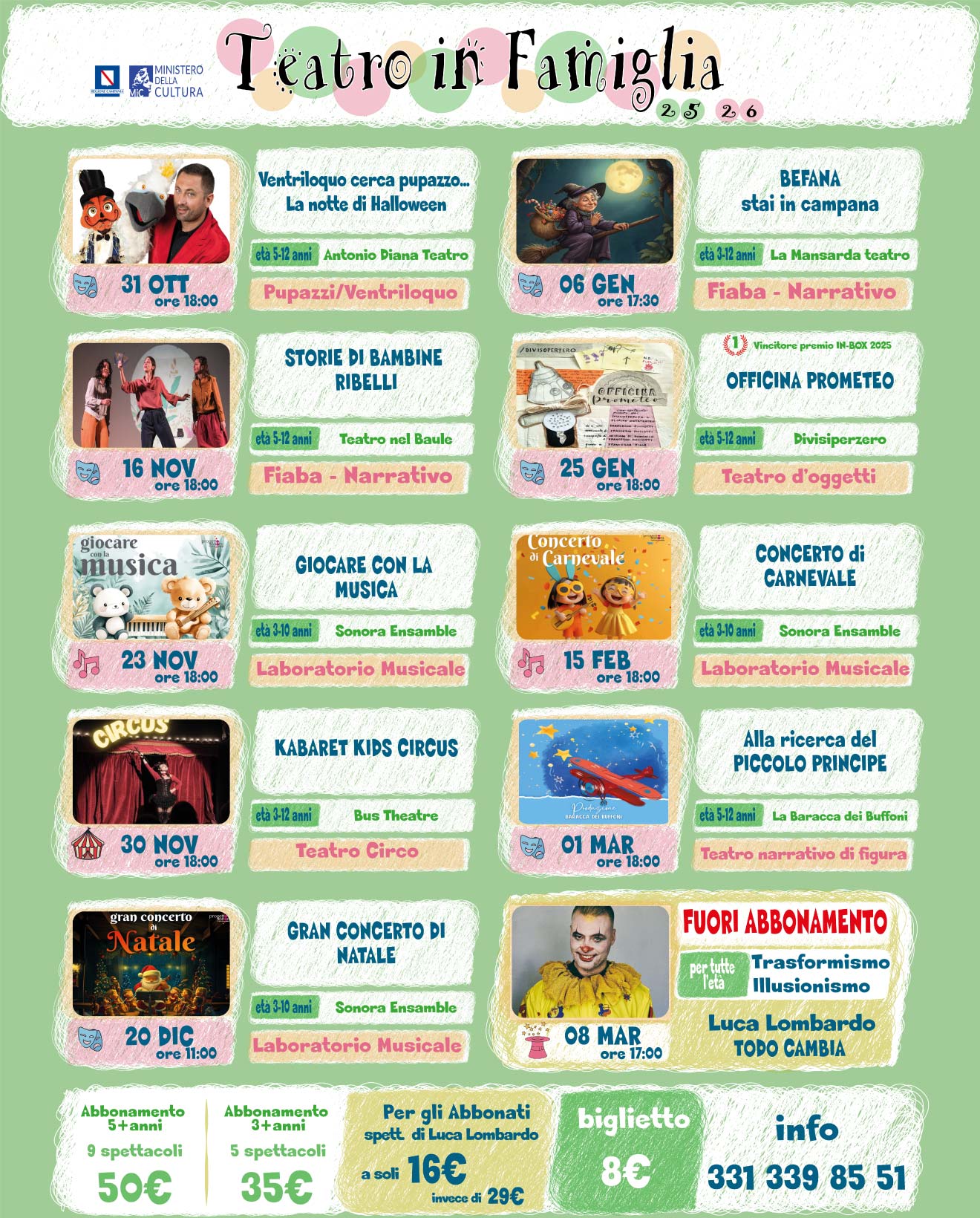 La rassegna Teatro In Famiglia prevede spettacoli di prosa che narrano storie avvincenti ed entusiasmanti e degli spettacoli musicali interattivi. Quest’ultimi prevedono la partecipazione attiva dei bambini/ ragazzi e dei loro accompagnatori, insieme sul palcoscenico con l’aiuto degli esperti daranno vita ad un “concerto”, avvicinarsi alla musica da protagonisti e condividere questa esperienza con i propri cari.